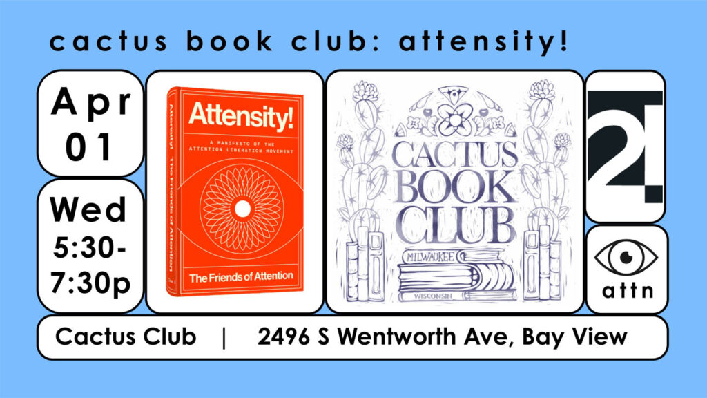 Cactus Book Club (CBC), organized by Cactus+, meets on the first Wednesday of the month from 5:30-7:30 in the back room at Cactus Club. Each month a different community organization, collective, mutual aid group, or business chooses the book and recommended bookseller, then leads the discussion. CBC covers sociopolitical fiction and non-fiction, with a focus on works by women, LGBTQ+, BIPOC, and/or otherwise under-published groups. Members don’t have to finish reading the book to attend. All book club meetings are free. Registration is not required. 18+.