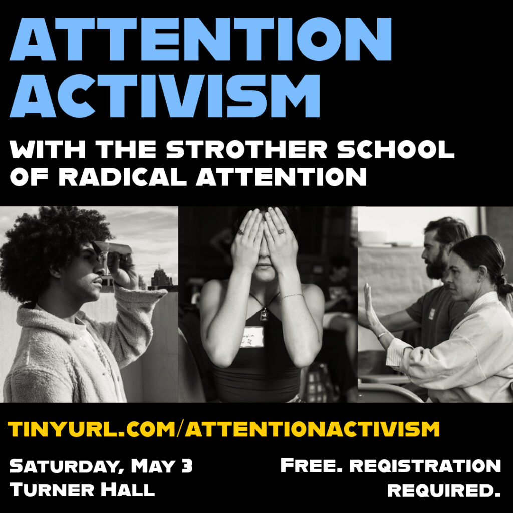 Palmer Room @ Turner Hall, 1040 N Vel R. Phillips Ave, Milwaukee, WI Overview: Join C21 and the Milwaukee Turners for a day-long series of workshops led by the Strother School of Radical Attention (SoRA), an organization that promotes human … Continue reading Attention Activism with the Strother School of Radical Attention