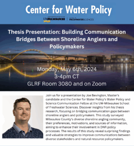 On Monday May 6th, 2024, Joe Bevington, Master’s candidate and the Center for Water Policy’s Water Policy and Science Communication Fellow at the UW-Milwaukee School of Freshwater Sciences presented on his Master’s thesis project, “Building Communication Pathways Between Shoreline Anglers and Natural Resource Policymakers”. This study surveyed Milwaukee County’s diverse shoreline angling community, their preferences, motivations, and sources of information, aiming to enhance their involvement in DNR policy processes. The results of this study revealed surprising findings and valuable strategies to improve communications between diverse stakeholders and natural resource policymakers.