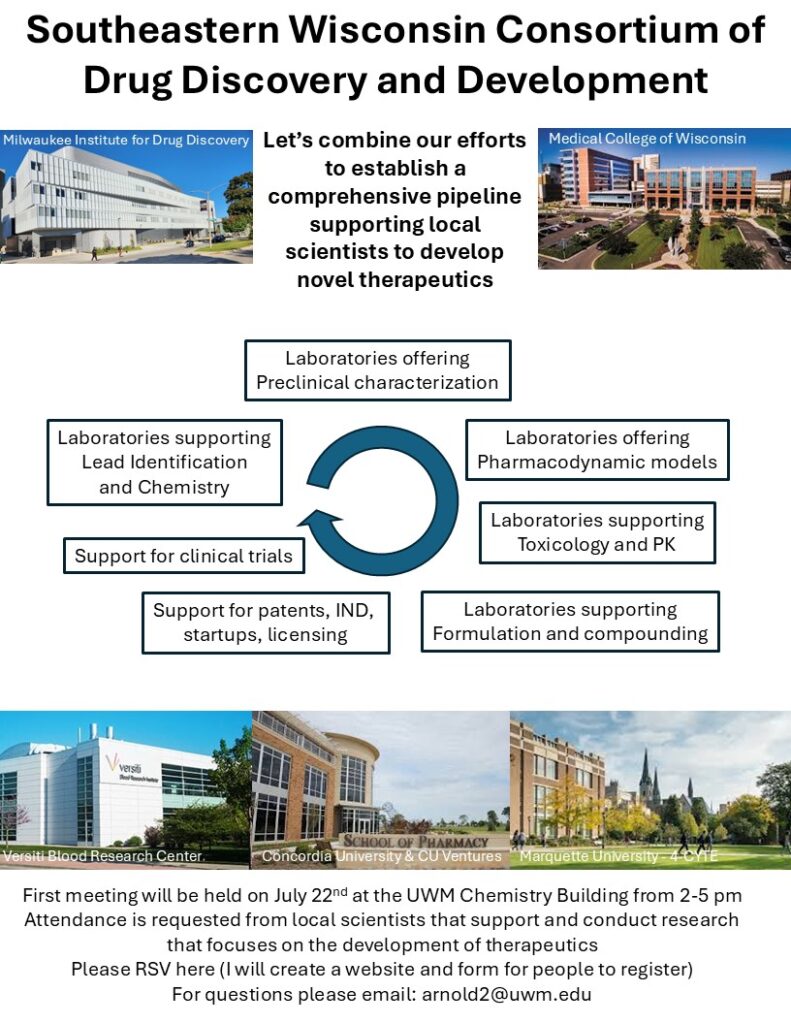 The first Southeastern Wisconsin Consortium for Drug Discovery and Development Meeting was held on the 22nd of July 2025 at the new UWM Chemistry Building. Representative from local industry and academic institutions attended this three hour meeting that was supported by the following presentations: