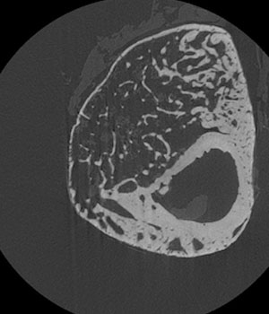 A 2D X-ray (microCT) image of a cross section of a mouse’s tibia (solid, bottom right). The outer portions are referred to as the callus and contain the healing bone along with cartilage and cells such as inflammatory and mesenchymal stem cells. When UC2288 is injected at the site of fracture, increased volume is observed in the callus. Premnath aims to spur mesenchymal stem cells, found in the bone marrow and lining of the bone, to become osteogenic cells that will contribute bone regeneration.