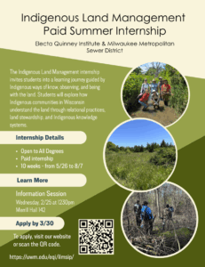 The Electa Quinney Institute and the Milwaukee Metropolitan Sewer District invite students to learn about the Indigenous Land Management Paid Summer Internship, a 10‑week summer experience grounded in Indigenous ways of knowing, observing, and being with the land.