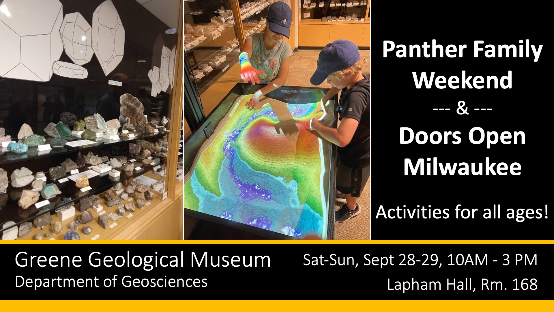 Celebrate Doors Open Milwaukee AND Panther Family Weekend at UWM’s Greene Geological Museum. Take home the Wisconsin state rock and participate in fun activities for all ages, including a fluorescing rocks display and an augmented reality sandbox. Learn about earth … |
