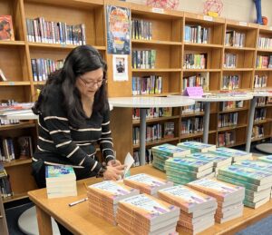 Grande signing copies of her memoir. Each Wedgewood student in attendance received a signed copy of either The Distance Between Us (young reader’s edition) or La distancia entre nosotros. Funding for the books was generously provided by UWM’s Institute for World Affairs and Center for Latin American and Caribbean Studies, both Title VI National Resource Centers through the U.S. Department of Education.