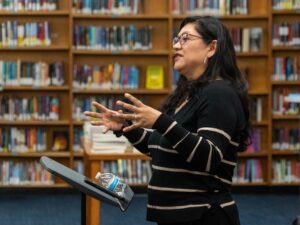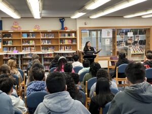 Eighth grade students at Milwaukee’s Wedgewood Park International School got a treat one recent February morning: a visit from bestselling author Reyna Grande, whose memoir they read during their fall semesters. As the clock approached 10:00 AM, students filed into the library, with librarian Erin Flood-Harrison passing out the notecards they had prepared with questions for the author. Their teachers (and a few visitors from the district!) joined them, and a crowd of about 80 people settled in to hear Grande speak about her personal and professional experiences.