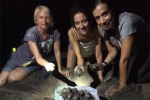 Three people on a sea turtle nest patrol near La Ventanilla, Mexico