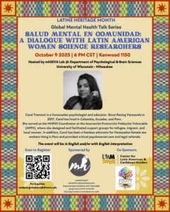 CLACS is delighted to partner with UW-Milwaukee’s mhSEVA lab (Department of Psychological & Brain Sciences) for a 3-talk Global Mental Health Talk Series this fall in honor of Latine Heritage Month.