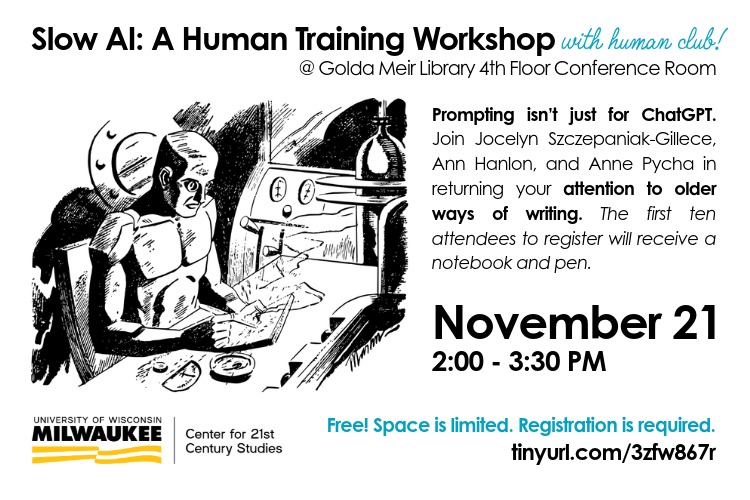 Join the Center for 21st Century Studies on Friday, Nov. 21, for “Slow AI: A Human Training Workshop,” where we’ll practice the tech-free ways of writing and thinking that get hijacked by – but are also prototypes for – contemporary productivity models.