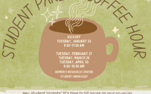 UWM students who are parents are invited to a student parent coffee hour in the Women’s Resource Center (Union, EG37) on Tuesday, Feb. 27, from 9:30 to 10:30 a.m.