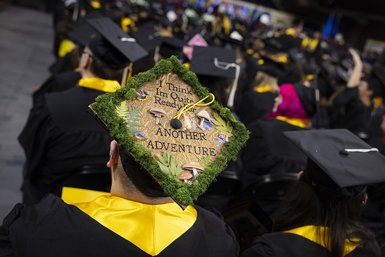 A student decorated their cap with a Bilbo Baggins quote from "Lord of the Rings": "I think I'm quite ready for another adventure." (UWM Photo/Elora Hennessey)