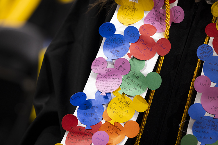 Childhood education major Maddie Masse shows off her stole signed by her students and colleagues. (UWM Photo/Elora Hennessey)