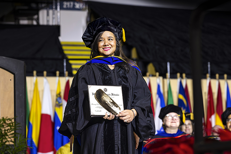 Lea Denny looks toward the audience after she is hooded as an honorary degree recipient with a doctorate of Community Mental Health and Leadership in recognition of her decades of work researching and developing a comprehensive mental health model that directly addresses historical and intergenerational trauma. (UWM Photo/Elora Hennessey)
