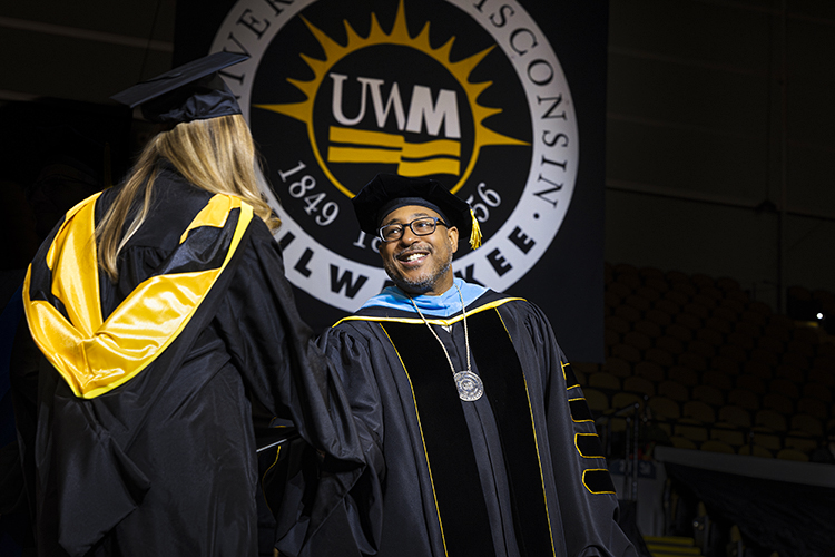 Chancellor Thomas Gibson shakes hands with a graduate student on stage. (UWM Photo/Elora Hennessey)