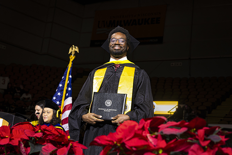 MLIS graduate student Nana Yorke pauses for a photo after receiving his master's diploma. (UWM Photo/Elora Hennessey)