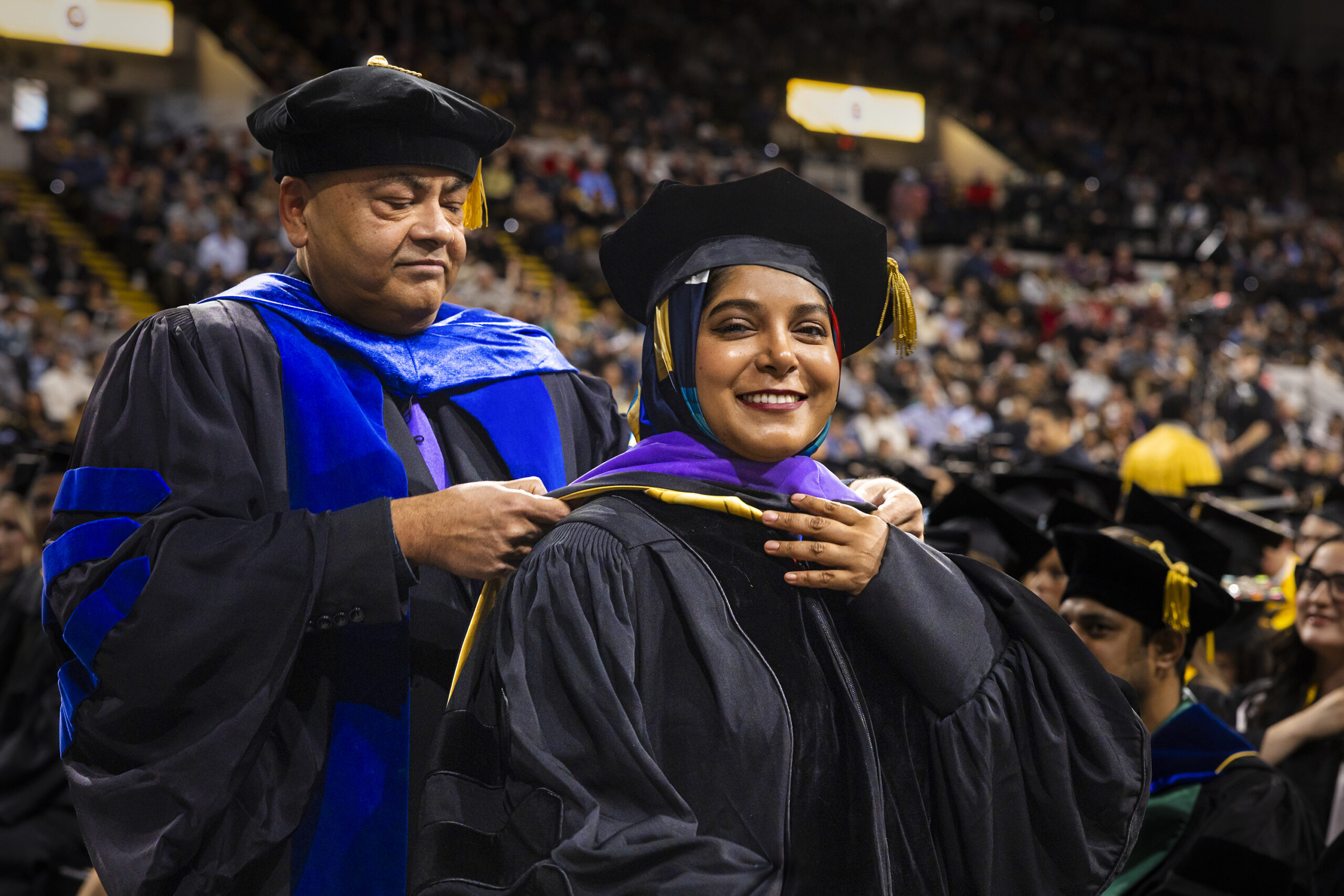 Arijit Sen, professor of architecture and urban studies, hoods Mania Taher who received her PhD in architecture. (UWM Photo/Elora Hennessey)