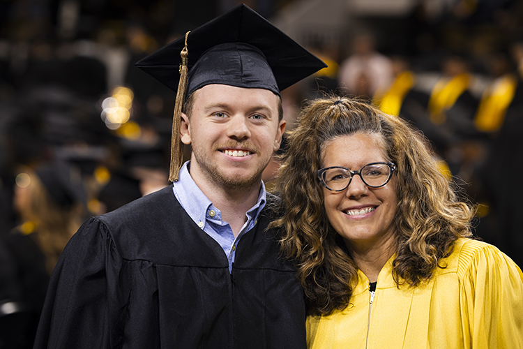 Lubar College of Business PhD Program Coordinator Monica Camacho embraces and poses with her nephew Max Meskin as he graduates from the College of Business. (UWM Photo/Elora Hennessey)