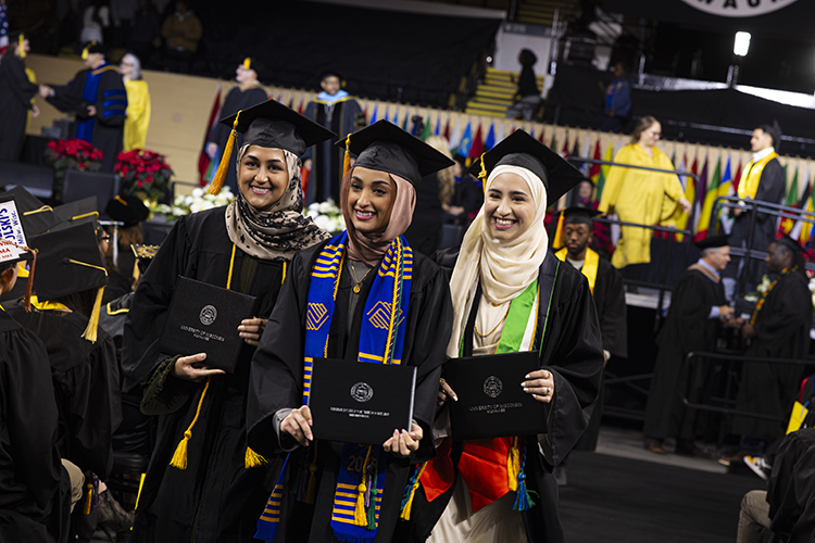 Friends Fadwa Kahla, Aisha Hameed and Natalie Suboh walk together arm in arm after receiving their degrees. (UWM Photo/Elora Hennessey)