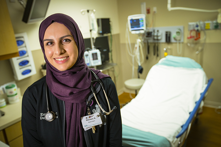 Nisreen Atta has worked as an emergency department technician in the ER at Aurora St. Luke's Medical Center for three years while studying at UWM to be a nurse and being involved in charitable projects and the community. She has accepted a job offer in the ER as a nurse at St. Luke’s. (UWM Photo/Chris Baylor)
