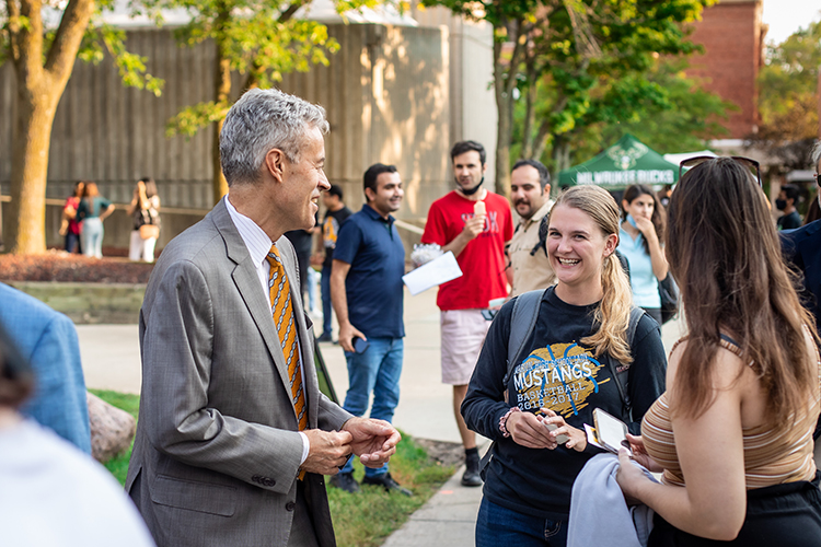 Accompanied by UWM Chancellor Mark Mone and Chief Student Affairs Officer Kelly Haag, Thompson mingled with students at the Welcome Back Block Party, which is part of UWM’s two weeks of Fall Welcome festivities.