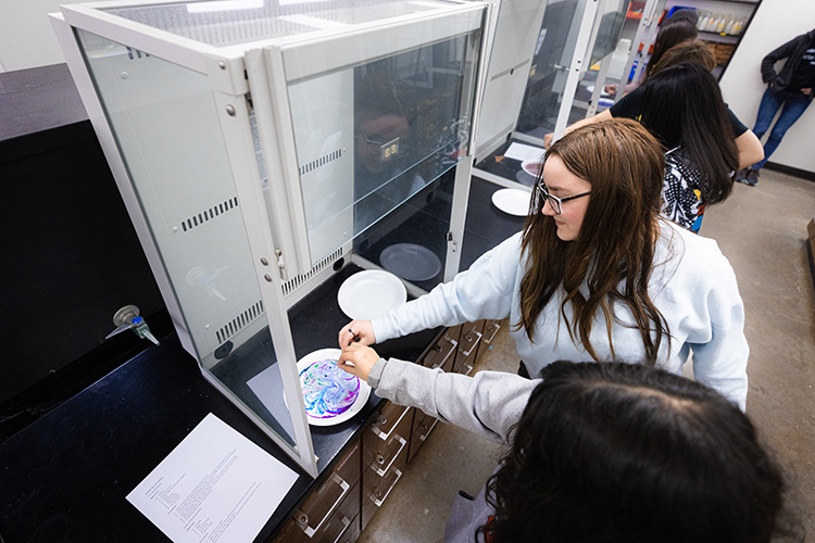 Students try out the “Colors of Chemistry” experiments. (UWM Photo/Elora Hennessey)