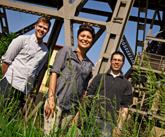 Graduate students Blake Villwock (left), Adriana Arteaga and Chad Bloedel meet at the base of the 35th Street bridge where they designed a multi-level public space intended to bring together people and bats.