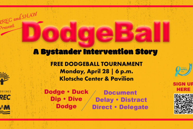 If you can dodge a wrench, you can intervene. Explore the five D’s of dodgeball and the five D’s of bystander intervention in a one-of-a-kind mashup of Dodgeball: A Bystander Intervention Story on Monday, April 28, at 6 p.m. at the Klotsche Center and Pavilion.
