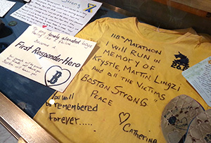 Notes of encouragement and remembrance – and even running shoes – were on display at the Marathon Memorial in the Boston Public Library.