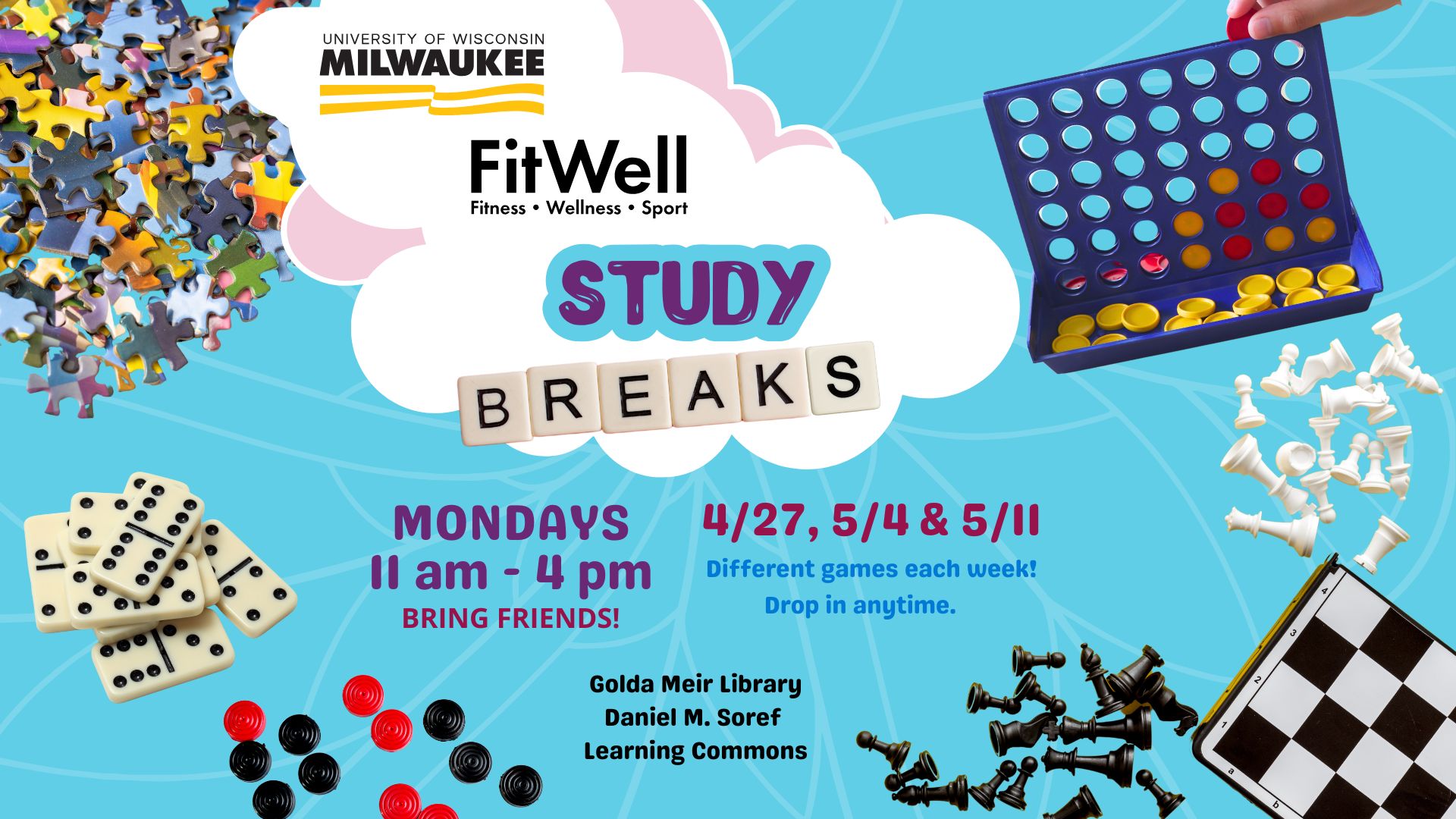 Join us for Study Breaks with FitWell at the Library on Mondays from 11 am – 4 pm!