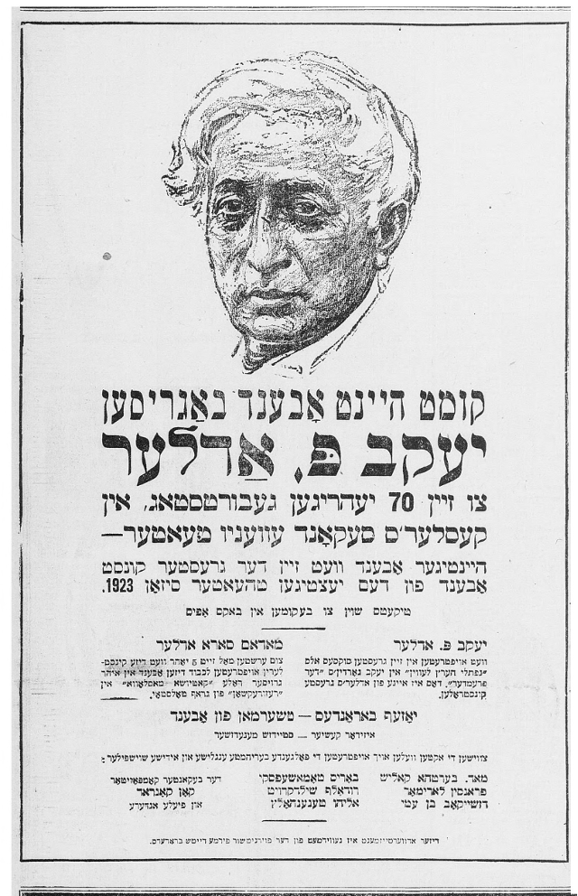 - “Kumt obgeben koved dem nesher ha-godol Yankev P. Adler,” display ad, Forverts, December 2, 1922. ↩︎