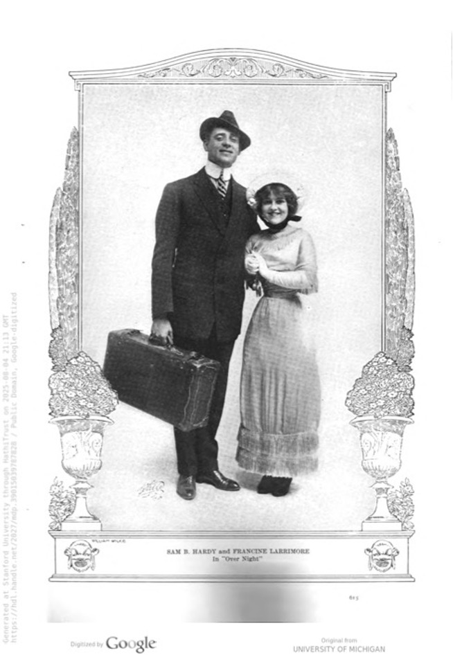 - “Francine Larrimore Scoffs at Glamour, Dazzle of the Stage,” Jewish Telegraphic Agency, October 28, 1934; “Who’s Who in the Cast,” in Vincent Freedlen presents Francine Larrimore in “The Temporary Mrs. Smith” [Wilmington:] The Playhouse, [1946]. A copy of this program is in the Francine Larrimore Papers, 1916-1965 (Collection Number 05976, Box 16), American Heritage Center, University of Wyoming. Wikipedia summarizes the plot of Over Night as follows: “The story concerns two mismatched newlywed couples who are compelled to temporarily swap partners through circumstance while traveling.” See: “Over Night,” Wikipedia: https://en.wikipedia.org/wiki/Over_Night. The May 1912 issue of Sunset ran a photo of her with a fellow actor, Sam B. Hardy, while their company was touring the West Coast. The top of Francine’s bonnet barely reached Hardy’s shoulder. ↩︎