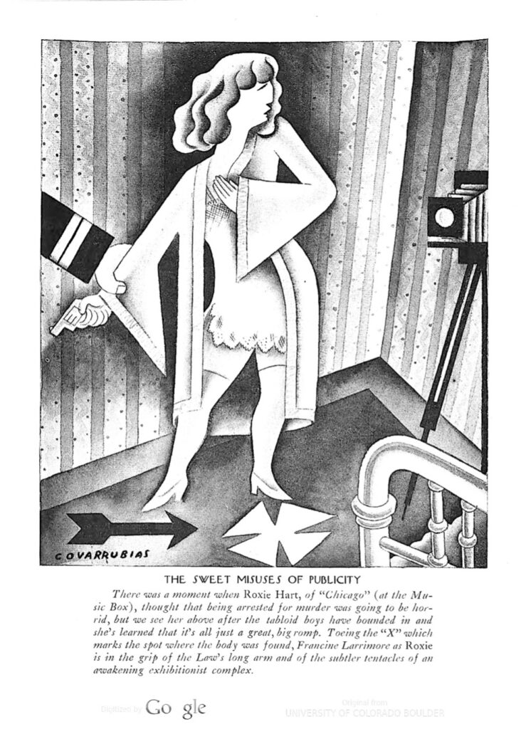The original Roxie Hart was played by a “flapper comedian” named Francine Larrimore (1898?-1975). A newspaper columnist described her as “a wild, untamed, sensual, alluring Roxie, all sex appeal, quivering, alive—utterly unmoral. She is an animal out of a jungle. She is as conscienceless as a child.”4 The artist Miguel Covarrubias captured these qualities in his New Yorker caricature of Larrimore’s Roxie.