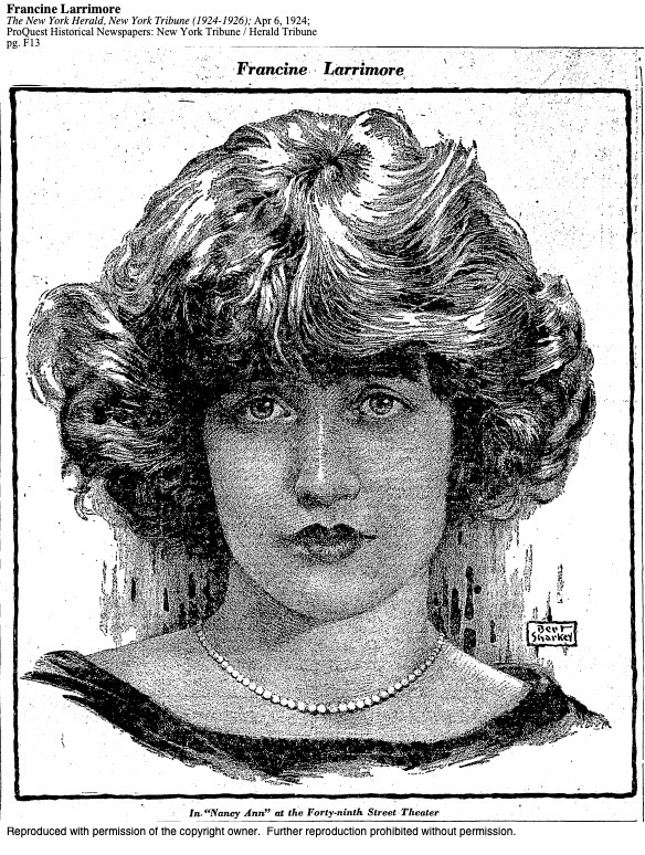 - “Francine Larrimore,” Internet Broadway Database (IBDB): https://www.ibdb.com/broadway-cast-staff/francine-larrimore-48979. In addition, Larrimore acted in touring companies, regional tryouts, and in London. ↩︎