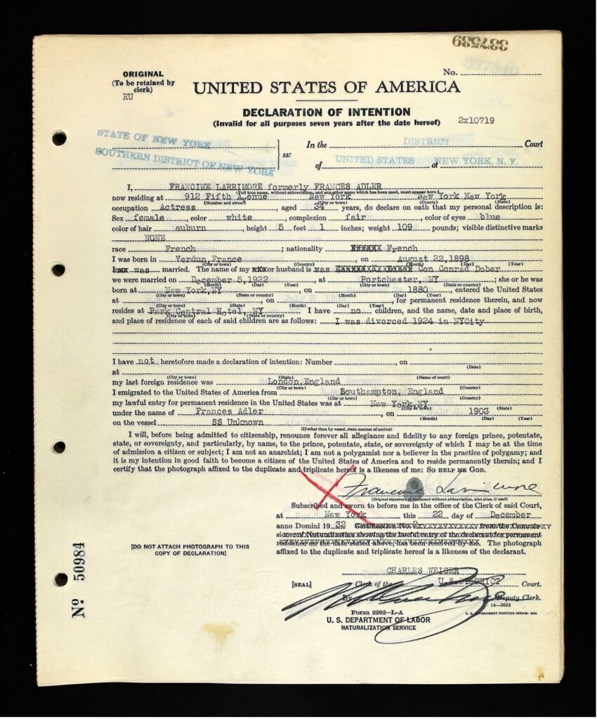Larrimore’s Declaration of Intention for naturalization (filed in December 1932) states that she emigrated from Southampton, England, in 1903, on the “SS Unknown,” under the name Frances Adler—her legal name in the US.27 In her Petition for Citizenship (filed in May 1935) she affirmed that she had resided continuously in New York City since May 1903, when she was (supposedly) not quite five years old. In both documents she stated that she was born in Verdun, France, on August 22, 1898, and that her nationality was French.28 Some of these details are debatable, to say the least.