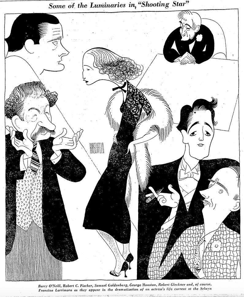 Francine Larrimore’s name cropped up while I was searching the Historical Jewish Press site for mentions of the Yiddish actor Samuel Goldenberg. Among the results was a review by Abraham Cahan of a Broadway play called Shooting Star, by Noel Pierce and Bernard C. Schoenfeld.6 Over the course of eleven scenes and three-and-a-half hours, it depicted the meteoric rise and fall of a fictionalized diva named Julie Leander. Francine Larrimore played Julie and Goldenberg was Herman Mordecai, an impresario of German-Jewish background inspired perhaps by Oscar Hammerstein (Senior) or Daniel Frohman. The caricaturist Al Hirschfeld produced a marvelous sketch of the cast. Shooting Star ran for just sixteen, un-air-conditioned performances in June 1933 before being taken down.
