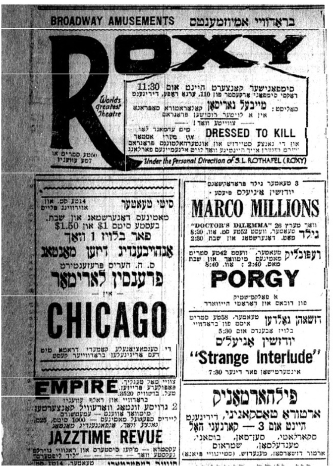 - “Der yontev fun dem idishen teater… Yankev P. Adler,” display ad, Forverts, February 2, 1926. This event took place at Kessler’s Second Avenue Theatre. ↩︎